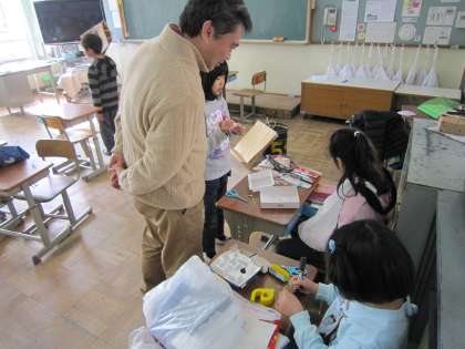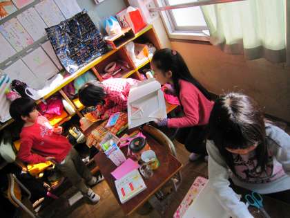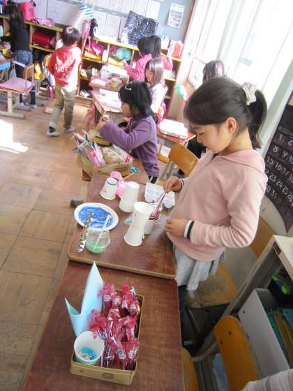グループで話し合い,手分けしてお店の準備をしている子ども達です。