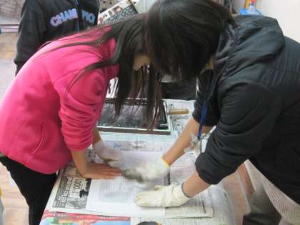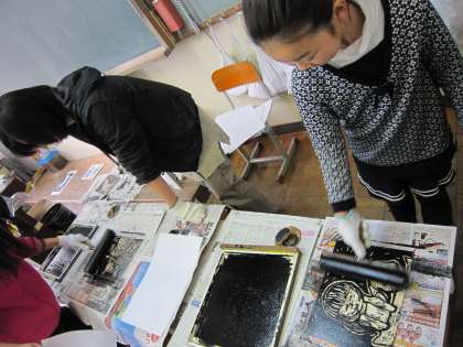 4年生は,木版画に取り組んでいます。彫刻刀で彫るのは,筆で絵を描くのとは違い,苦労する子が多かったですが,彫り終え,刷りに入りました。黒いところは真っ黒になるようにインクをつけ刷っていきます。