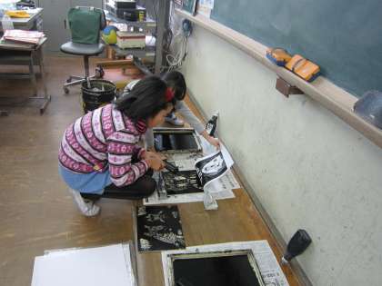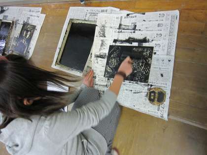 刷るときに,はじめからインクをたくさんつけるとせっかく彫ったところが埋まってしまいます。これでは,何もしていないのと同じになってしまうので,インクをつけすぎないように考えながら刷っていきます。