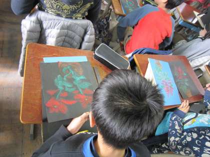 白黒の版画作品もいいのですが,5年生の作品のように色版画のいいものです。