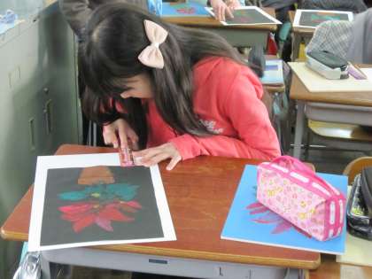 5年1組では,一版多色刷りの版画作品が出来上がり,台紙に張り付けていました。