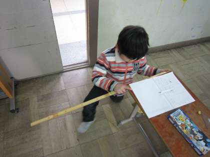 2年生は,長さの学習をしています。今日の2組では,1mってどれくらいなのかを体感しようと,いろいろなところを測っていました。