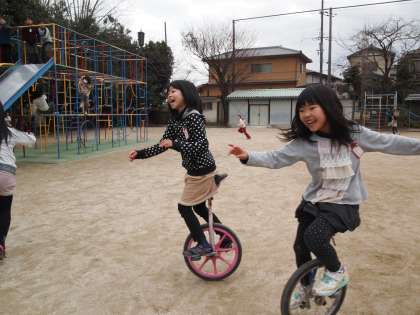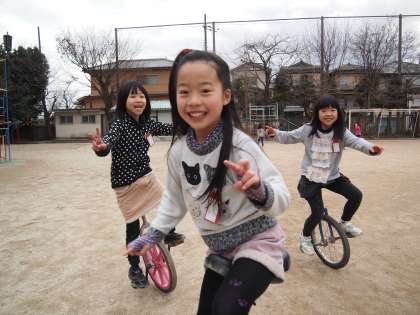 「は〜い,こっち向いて!」と一輪車の子ども達に声をかけました。楽しそう!