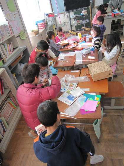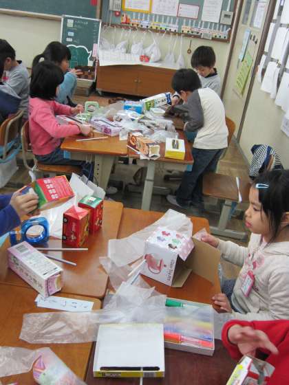 1年生は,先日図工でニョキニョキとびだせを給食の牛乳パックを使って作っていました。今日は,いろいろな箱を使って作っていました。楽しそうに作っていました。
