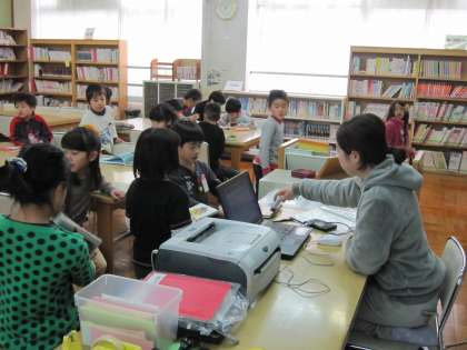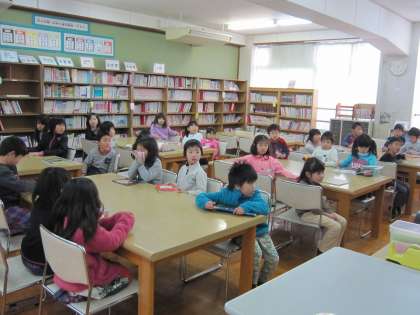 中を見ると,1年2組の子ども達が,本の借り換えをしようと図書室に入っていました。
