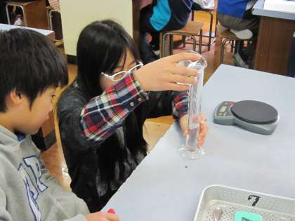 実験の準備として,まずメスシリンダーで水50mLを量る練習をしました。できたというグループのメスシリンダーを見ると,48mLというところもありました。メスシリンダーの水の高さに目の高さを合わせないといけないのですが,少し上から見てしまっていたようです。