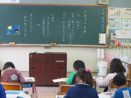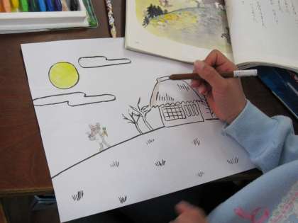 1年1組では,国語でたぬきの糸車の一つの場面でお話を思い浮かべながら絵にしていました。