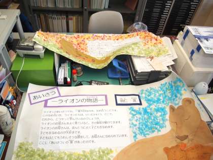 今回の掲示物は紙を重ねたり花紙をちぎって張り付けたり…,なかなかに凝ったものになっています。明後日,金曜日の研究発表には間に合わせてくれるようなので,参観の際にぜひ実物をご覧ください。