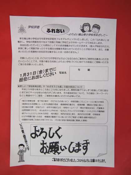 先日お渡しておりました学校評価「ふれあい」:後期保護者版は明日が締め切りになっております。誠に恐れ入りますが封筒に入れ担任に渡りますようにどうぞよろしくお願いいたします。