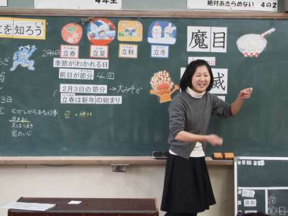 栄養教諭の山田先生の授業です。4年2組のみんなは「節分献立について知ろう」という学習でいろんなことを知りました。鰯と柊の関係や豆の語源についても教えてもらいました。