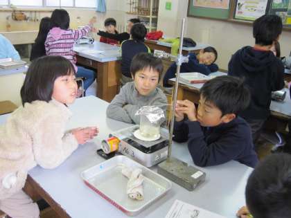 水の温度変化を確かめた後,熱していくとビーカーの口から何やら出ているようなので,たしかめる実験をしました。