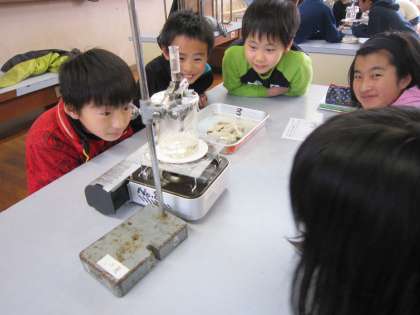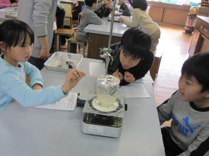 子ども達は,スプーンにつく水滴を見たり興味深く実験をしていました。