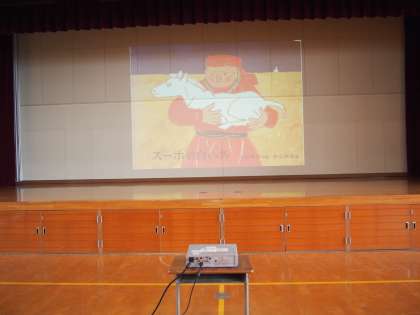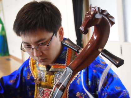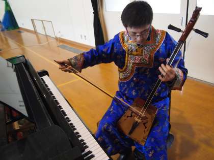 楽しみにしていた内モンゴルからの留学生ボヤンさんのお話と馬頭琴の演奏会がありました。写真は本番を前に緊張した表情で音合わせをしているところです。