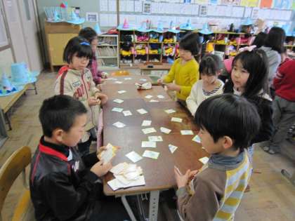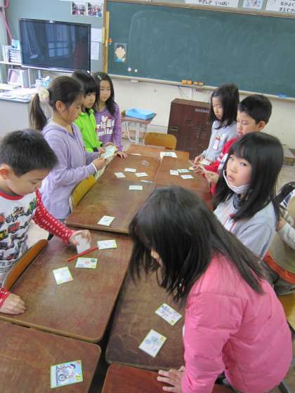 一人の子が読み手になり,あとの子たちが札をとっていました。楽しそうにとっていました。