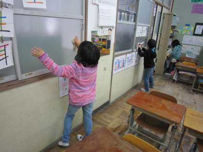 雪の舞う寒い中,ふき掃除をがんばる子ども達がいました。
