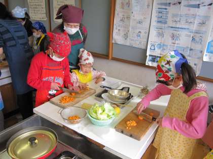 子ども達は,おうちの人や講師の方々に,包丁の持ち方や切り方を教わりながら,食材を切っていました。