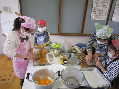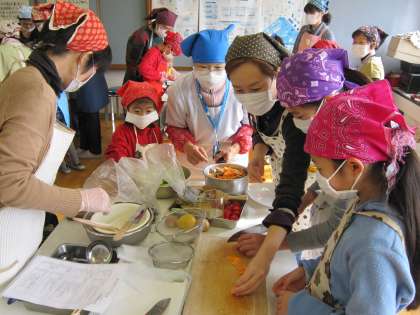 今日は,食育の原点家庭の味を親子一緒にクッキング。自然の食材を生かして無形文化遺産となった日本料理にチャレンジしています。