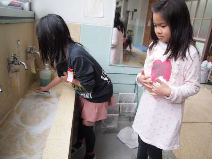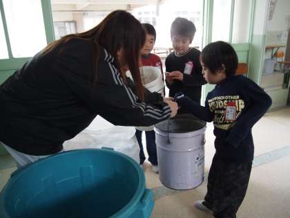 ごみを持って行って用務員さんに缶を渡す時は「お願いします」,そしてその後は「ありがとうございました」が自然に出るといいですね。