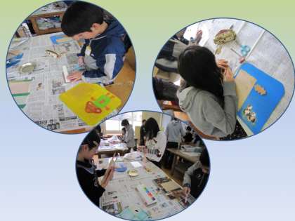 5年生は,図工展に向けて伝言板作りに励んでいます。