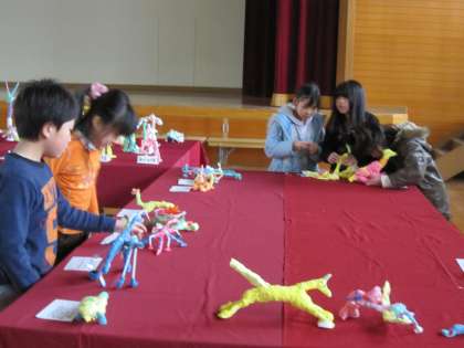 子ども達は,順々に自分の立体作品をもって体育館に並べています。