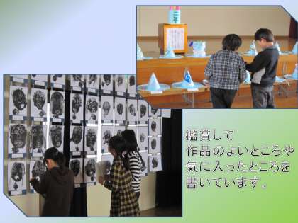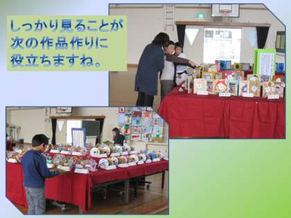 手にはボードをもち,作品を見ながらその作品のよいところや気に入ったところを書いていました。友達の作品のよいところに気づくと次に自分が作ろうとするときのアイディアとして役に立ちます。しっかりと鑑賞している子ども達の次の作品が楽しみです。