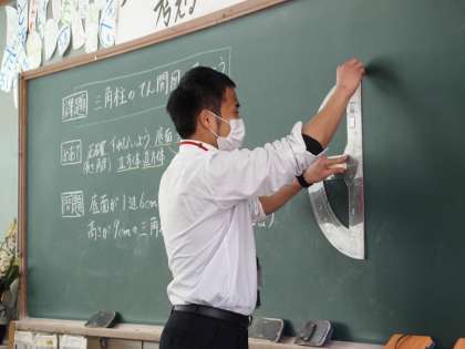 5年1組も立体で「三角柱の展開図をかこう」の課題にチャレンジしていました。