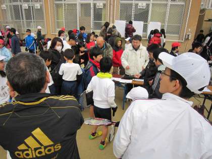 9時になり,開会式です。本校校長や担当者からの話を静かに聞いた後,第1試合の選手は受付でトスをし,コートへと向かいました。