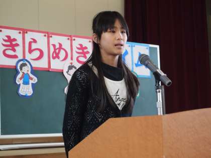 本日は今年度最後の「きらめきタイム」でした。発表者の6年生の4人。卒業を間近に控え今の気持ちを語ってくれました。
