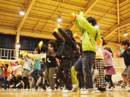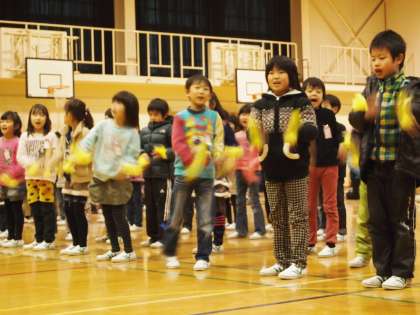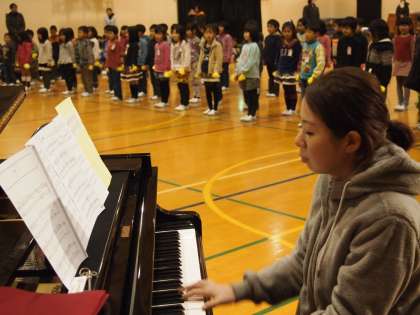 トップバッターは1年生。とても元気よく振り付きで『ともだちさんか』を歌ってくれました。手につけた黄色いミニぽんぽんがすごくかわいかったです。