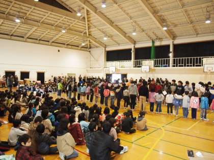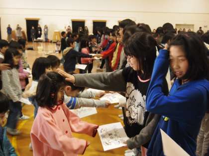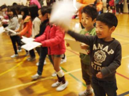 1年生から6年生にお手紙のプレゼントがありました。可愛い1年生の頭を撫でている6年生もいましたよ。