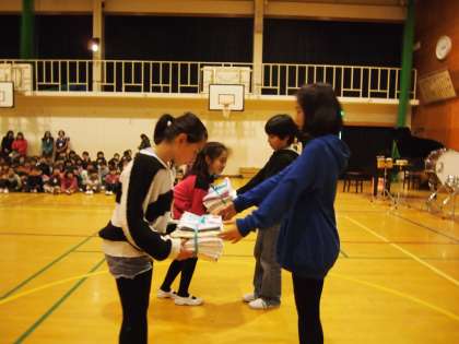 最後に6年生が縫ってくれた雑巾のプレゼントがありました。うれしいですね。1年生が受け取ってくれました。大切に使わせてもらいます。ありがとう。