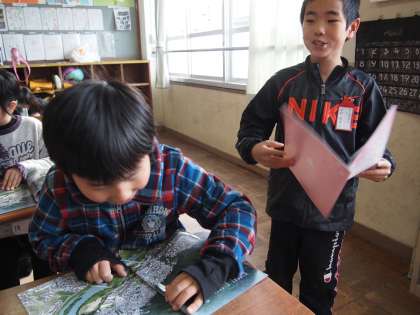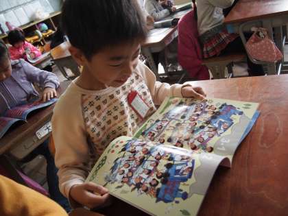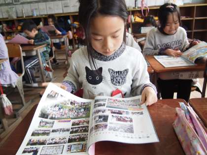 まずは表紙の全校児童が写っている写真から自分の姿を探していました。