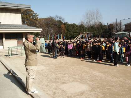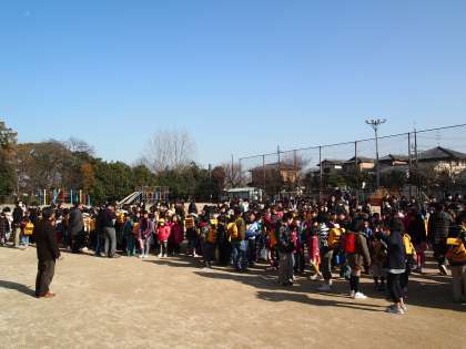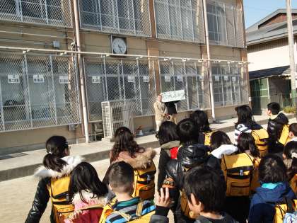 教室での話し合いが終わりました。全校児童が運動場に出て集団下校の準備をします。学校長から「登校班で並んで歩くこと」と「見守り隊の方にきちんとあいさつをすること」の2つのお話がありました。保護者の皆様もこの2点について,ご家庭でもお話していただき,周知徹底をお願いします。