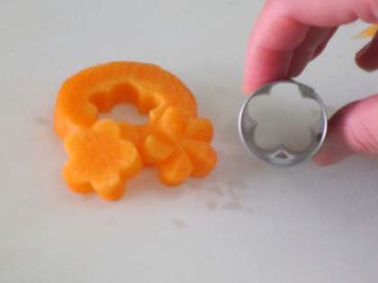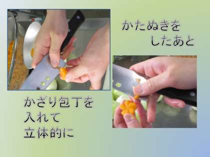 ハッピーキャロットの日というのは,にんじんを花の形に型抜きし,飾り包丁を入れ,今日ならシチューに入れるという取組です。