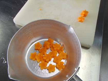 調理の中で,飾り包丁を入れたにんじんもつくられていきました。各クラスに1個ずつシチューに入れていきました。