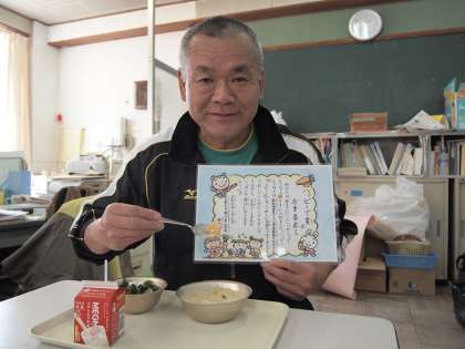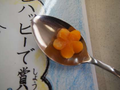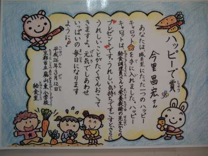 今日の給食のハッピーキャロット,職員室では校長のシチューの中に入っていました。口に入れると「シアワセ」が広がりました。おまけに賞状までいただいて申し訳ない気持ちです。どうもありがとうございます。