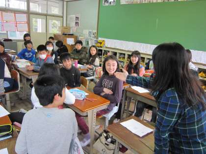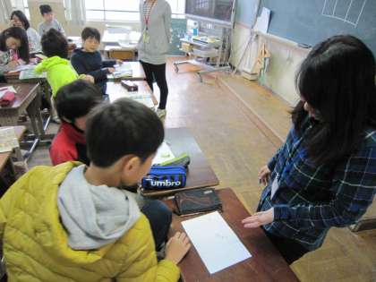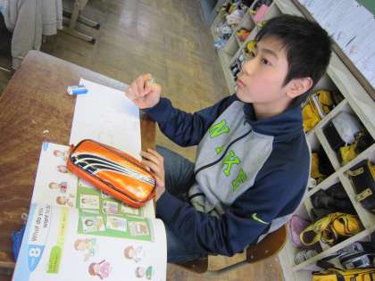 1時間の最後には,各自でグリーンのものの絵を描き,英語や日本語で順に発表していくというゲームをしていました。このゲームは,友達同じものをイメージしてはいけないというものです。