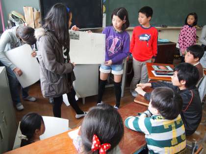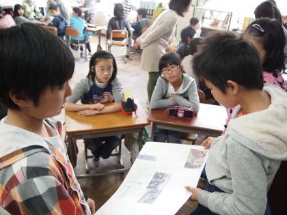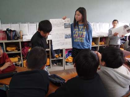5年生が4年生の教室を訪ねてスチューデントシティの報告会をしました。