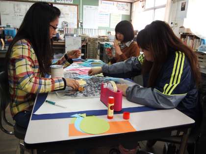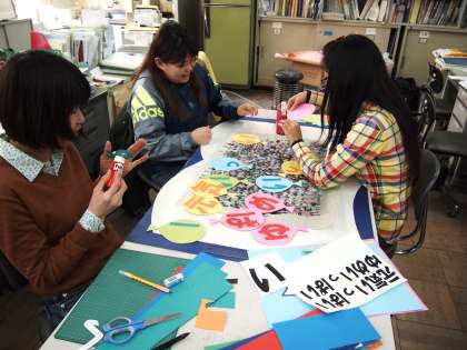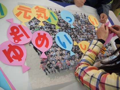 「掲示板用飾り制作現場」から,ただ今写真が届きました。今年度の最終回です。良いのができそうです。