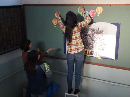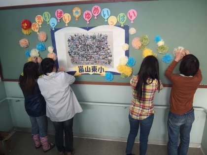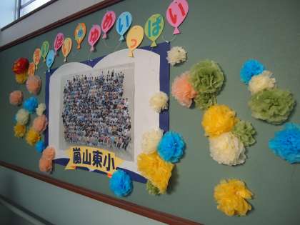 いつもながらワイワイガヤガヤ言いながら,みんなで掲示板に飾り付けていきました。そばで見ていると結構凝った手作り感が素敵ですよ。校章は書いたのではなくて切り貼りです。なんと芸が細かい!