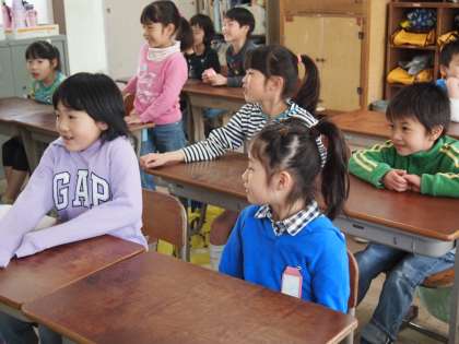ちょうど「森先生クイズ」をしているところでした。「先生の好きなおみそ汁の具はなんでしょう?白い色をしていますよ」みんなニコニコしながら手を挙げていました。