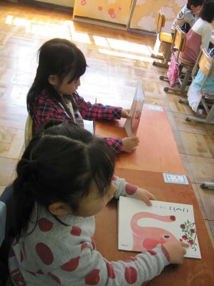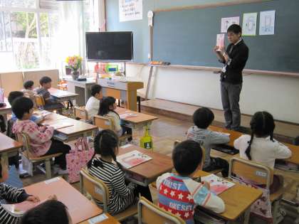 1年2組では,国語の教科書を手に,「教科書の表紙には,いろいろなものが隠れていますよ。先生の言うものを探してみましょう。」と語りかけ,みんなで探し物を探し始めました。