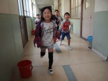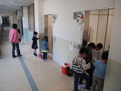 1年生がトイレの使い方を教わっていました。スリッパがきちんと片付いているような状態が常にあるといいのですが…。何事も最初が肝心ですね。