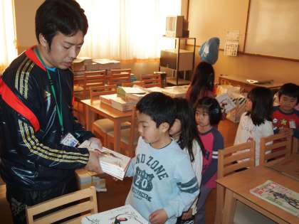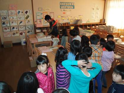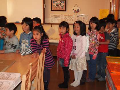 ランチルームに新しい教科書が届いています。先生からそれをもらう間,みんなきちんと並んで待っています。静かに待っていられて感心!
