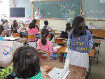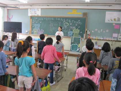 2年2組に行くと,しっかり挨拶をした後,担任が黒板に絵を描きはじめました。そして,「これは何でしょう。」と尋ねました。子ども達はいろいろなことを言っていましたが,「たんぽぽ」という声が多かったです。たんぽぽのちえという学習をこれからしていきます。その導入で絵を描いていたのでした。