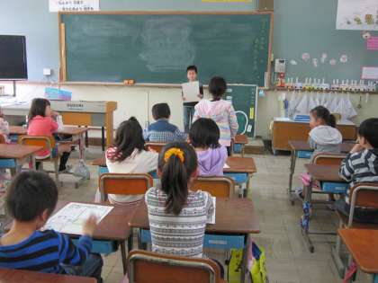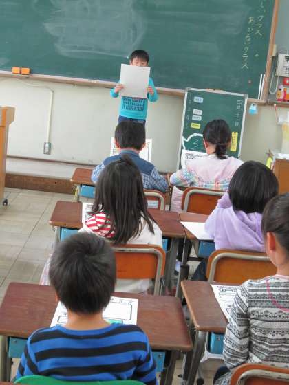 2年2組では,自己紹介カードに書いた後,みんなの前で発表していました。今日から2列ずつ発表をしていくようです。