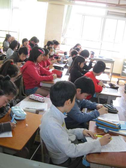 6年2組では,5年生で学習した算数の内容についてプリント使って復習していました。