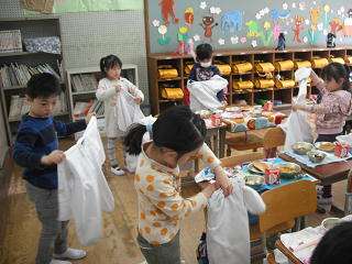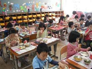 1年生にとっては給食のエプロンをたたむのも一苦労。片づけが終わったら今日の献立を発表して「いただきます。」のあいさつ。「おなかへった。」と言っていた子ども達は楽しみにしていた給食をおいしそうにいただきました。