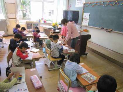1年生は,鉛筆の持ち方や鉛筆で線を引く練習をしています。習字を始めて学習するときと同じような学習を鉛筆の使い始めの1年生はしています。