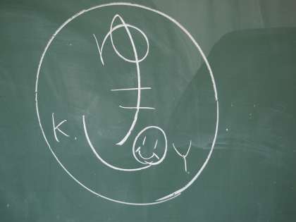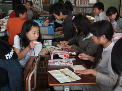 6年2組では自分のオリジナルロゴマークの製作中でした。「学級目標の周りに自分のマークを貼るんですよ」ということです。独創的なものができるといいですね。